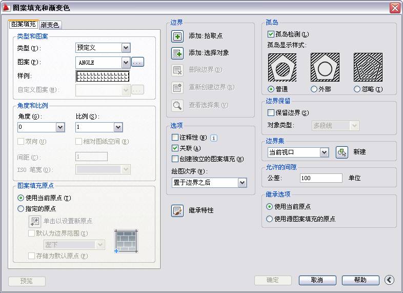 | 第8章 填充与编辑图案 本章要点 ■为指定的区域填充图案 ■编辑已填充的图案 8.1 填充图案 用指定的图案填充指定的区域。命令: BHATCH 单击“绘图”工具栏上的图案填充按钮 ![]() 对话框中有“图案填充”和“渐变色”两个选项卡。 (1) “图案填充”选项卡 此选项卡用于设置填充图案以及相关的填充参数。其中,“类型和图案”选项组用于设置填充图案以及相关的填充参数。可通过“类型和图案”选项组确定填充类型与图案,通过“角度和比例”选项组设置填充图案时的图案旋转角度和缩放比例,“图案填充原点”选项组控制生成填充图案时的起始位置,“添加:拾取点”按钮和“添加:选择对象”用于确定填充区域。 (2) “渐变色”选项卡 单击“图案填充和渐变色”对话框中的“渐变色”标签,AutoCAD切换到“渐变色”选项卡,如后面的图所示。 ![]() 该选项卡用于以渐变方式实现填充。其中,“单色”和“双色”两个单选按钮用于确定是以一种颜色填充,还是以两种颜色填充。当以一种颜色填充时,可利用位于“双色”单选按钮下方的滑块调整所填充颜色的浓淡度。当以两种颜色填充时(选中“双色”单选按钮),位于“双色”单选按钮下方的滑块变成与其左侧相同的颜色框和按钮,用于确定另一种颜色。位于选项卡中间位置的9个图像按钮用于确定填充方式。 此外,还可以通过“角度”下拉列表框确定以渐变方式填充时的旋转角度,通过“居中”复选框指定对称的渐变配置。如果没有选定此选项,渐变填充将朝左上方变化,可创建出光源在对象左边的图案。 其中,“孤岛检测”复选框确定是否进行孤岛检测以及孤岛检测的方式。“边界保留”选项组选项组用于指定是否将填充边界保留为对象,并确定其对象类型。 AutoCAD 2011允许将实际上并没有完全封闭的边界用作填充边界。如果在“允许的间隙”文本框中指定了值,该值就是AutoCAD确定填充边界时可以忽略的最大间隙,即如果边界有间隙,且各间隙均小于或等于设置的允许值,那么这些间隙均会被忽略,AutoCAD将对应的边界视为封闭边界。 如果在“允许的间隙”编辑框中指定了值,当通过“拾取点”按钮指定的填充边界为非封闭边界、且边界间隙小于或等于设定的值时,AutoCAD会打开如右图所示的“图案填充-开放边界警告”窗口,如果单击“继续填充此区域”行,AutoCAD将对非封闭图形进行图案填充。 ![]() (3) 其他选项 如果单击“边界图案填充和渐变色”对话框中位于右下角位置的小箭头,对话框则为下图所示形式,通过其可进行对应的设置。 ![]() |