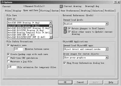 图15 “选项”对话框 选择“打开和保存”选项卡,在“文件另存为”一栏中,以适当的格式保存或转换当前文件的格式。 三、结束语 以上列出了在AutoCAD使用过程中,经常会遇到的一些问题及其原因和解决的办法。当然,这些都只是问题的一部分,在使用过程中一定还会遇到各种类型的问题。出现问题是很正常的,只要把计算机辅助设计中的内容和命令了解全面,理解透彻,总会找到产生问题的原因和解决问题的方法。