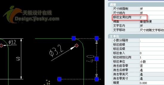 如果我们选择菜单“标注-样式”,打开标注样式管理器,“主单位”选项卡下,可看到调整标注线性比例的选项。“调整”选项卡下,可看到调整标注全局比例的选项。同时,它们分别对应两个系统变量DIMLFAC 和DIMSCALE,修改这两个系统变量的值,也等于调整了这两个比例。 有的初学者在新建或修改标注样式时,经常会混淆或迷惑,造成图纸出现比例方面的错误。 那么,为何尺寸标注会有两个有关的比例呢?它们有什么区别呢?下面就说明一下它们的作用和不同,以防止误用。 一般在绘制图形时,会根据情况不同而采用不同的比例,这就涉及到标注尺寸值的调整问题。 具体举例说明 比如某图形中的一个尺寸,实物值是10,按照2:1比例绘制,在CAD里面长度为20,比例因子是1的情况下进行标注,系统自动给出缺省值就是20,所以要将比例因子调整为1/2。 由此延伸开来,按照N:1绘制图形时,相应的标注比例就要调整为1/N。 而这个比例的调整,就是要设置或修改标注线性比例。 另外一个比例――标注全局比例,和标注的尺寸值无关,主要是控制标注各要素的大小,距离或偏移等。 现在为了绘图格式的统一和标准化需要,很多公司指定了自己的绘图模板,对一些绘图的要求作出了基本的规定。 比如一个绘图模板中,模板规定标注要素中的文字高度为4,箭头大小为2.5,这是在默认标注全局比例为1的情况下。 如果将标注全局比例调整为2,标注的尺寸值不会受到影响,而相关的尺寸要素――文字高度和箭头大小变为原来的一倍。 如图就是改变标注全局比例的例子。