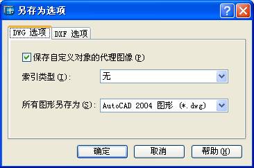 DWG选项卡表示如果您将图形保存为R13或以后版本的文件格式,并且图形包含来自其他应用程序的定制对象,则可以选中“保存自定义对象的代理图像”复选框。该选项设定系统变量“PROXYGRAPHICS”的值。在“索引类型”列表中,您可以确定当保存图形时,AutoCAD是否创建层或空间索引。在“另存为”列表中,您可以指定保存图形文件的缺省格式。如果您改变指定的值,则以后执行保存操作时将采用新的文件格式保存图形。
