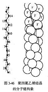 如果分子链上有体积较大的侧基,为了减小空间位阻和降低位能,高分子链只能采取螺旋形构象。例如聚四氟乙烯,由于氟原子的范德华半径比氢原子的要大,达0.14nm,它的两倍0.28nm已大于上面计算出来的平面锯齿状 链构象中等同周期0.252nm,因而聚四氟乙烯主链无法形成全反式平面锯齿状构象,而是采取一种扭转的构象,稍稍偏离全反式平面构象(图3-46)。聚四氟乙烯链采取的这种螺旋形构象,使碳链骨架四周被氟原子包围起来而呈螺旋硬棒状结构,因此聚四氟乙烯具有极好的耐化学药品性能。由于分子链间氟原子的相互排斥作用,使得分子间易于滑动,因此聚四氟乙烯具有润滑作用及冷流性质。