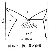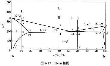 | 8.3 二元系相图(6) 3)共晶合金的非平衡凝固 在缓慢冷却平衡状态下,只有共晶成分的合金可获得共晶组织。但在较快冷却的不平衡状态,液相处于过 冷状态,此时共晶组织在更低温度、较宽的成分范围获得,如图8-14中影线所示液相线延伸的范围。在过冷条件下,影线成分范围的液相同时处于α和β二相的过饱和区,因而在该成分范围的合金可全部获得共晶组织。这种非共晶成分所得到的共晶组织叫伪共晶。 由于过冷度增大、结晶速度加快,液相成分来不及均匀化,其平均成分偏离液相线,故伪共晶区范围小于液相线延长所给的范围,如图8-15所示。在二组元熔点接近、共晶点居中的合金系具有对称形态,而在二组元熔点相差较大的合金系,共晶点偏向低熔点一侧,伪共晶区偏移一边,图8-16示出Al-Si系的伪共晶区范围。 伪共晶区对称或偏移的原因与二组元相的结晶速度有关。二相结晶速度接近,同时接近形成伪共晶组织,伪共晶区具有对称形态。若二相结晶速度相差很大,则结晶较快的相成为先共晶的初生相,使伪共晶区偏移。而二相结晶速度取决于二相成分和液相成分的差异。与液相成分接近的一相具有较大的结晶速度,易生成先共晶的初生相,显然,以低熔点组元为基的相有较大结晶速度,伪共晶区偏向高熔点组元一侧,在Al-Si合金中伪共晶区偏向Si的一侧,使共晶成分过冷液体先析出α相,至液相平均成分进入伪共晶区,才发生共晶反应,形成伪共晶,因而共晶成分合金在过冷情况下得到亚共晶合金的组织。 4)相图实例 ![]() 图8-17所示的是Pb-Sn二元共晶相图。Pb的熔点为327℃,Sn的熔点为231.9℃。α相为Sn在Pb中的有限固溶体,β相为Pb在Sn中的有限固溶体。aeb为液相线,acedb为固相线,cf是Sn在Pb固溶度曲线,dg是Pb在Sn中的固溶度曲线。 该相图有3个单相区:即液相L、固溶体α和固溶体β。单相区之间有3个两相区:即L+α、L+β和α+β。在L+α、L+β与α+β两相区之间有共晶线ced,是三相平衡线。共晶点成分为Pb:38.1%,Sn:61.9%,共晶温度为183℃。 共晶点成分的合金Ⅱ冷却到共晶温度时,将发生共晶反应,直到液相Le全部凝固完毕为止。此时共晶组织中 和 两个相的相对含量可由杠杆定律求得,即 冷却到室温后, Pb-Sn共晶合金的显微组织如图8-18(a)所示,α和β呈层片状交替分布,其中黑色为α相,白色的为β相。 w(Sn)=50%的合金Ⅲ属于亚共晶合金,该合金由液态缓慢冷却至1点时,开始结晶初晶α相。1~2点温度范围内,随着温度的缓慢下降,α固溶体的数量不断增多,而液相逐渐减少。当温度降至2点即共晶温度时,α相和剩余液相的成分分别达到c点和e点。此时两相的含量分别是: 在te温度下,成分为e的液相发生共晶转变。忽略共晶组织(αc+βd)析出的次生相,亚共晶合金在室温时的组织是α+(α+β)+βⅡ。图8-18(b)该合金的显微组织。图中暗黑色树枝状是初晶α,其中的白色颗粒为βⅡ,黑白相间分布的是共晶组织(α+β)。 w(Sn)=85%的合金Ⅳ属于过共晶合金。其平衡凝固过程及组织与亚共晶合金类似,所不同的只是初晶为β固溶体而不是α固溶体。其室温组织由初晶β、次生相αⅡ和共晶体(α+β)所组成。显微组织如图8-18(c)所示。 |