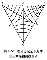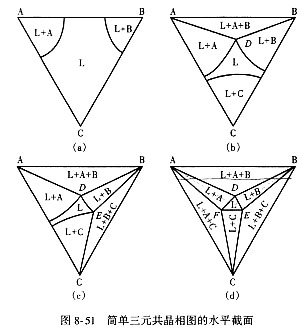 | 8.4 三元系相图简介(6) (2)投影图 把立体相图中所有的相区间的交线都投影到浓度三角形中,就构成了投影图,借助投影图可以分析合金 的冷却和加热过程。投影图中也常画出一系列水平截面中的相界线的投影,在每一条线上注明相应的温度,称为等温线。等温线可以反映三维相图中各种相界面的变化趋势。如图8-50所示。现以合金O为例,利用投影图来分析其凝固过程并判断其室温组织。图中AE1EE3,BE1EE2,CE2EE3是三个液相面的投影。E点是四相平衡转变共晶点的投影。图中还画出了不同温度的液相线等温线。合金O落在t3等温线上,表明在t3温度,合金O开始凝固,析出初晶B。温度降低时,不断析出B相,按直线规律,冷却过程中,液相成分沿OB延长线变化。在t0温度,液相的成分点落在三相平衡共晶线E1E上,表明在t0温度、剩余液相的成分点开始进入L+A+B三相区,开始发生三相平衡共晶转变L→A+B,液相成分沿t0E变化。液相成分达到E点时,剩余液相发生四相平衡共晶转变L→A+B+C。合金在室温时的组织为:初晶A+两相共晶(A+B)+三相共晶(A+B+C)。 (3)等温截面分析 组分A的熔点tA和三相共晶温度tE之间典型水平截面图如图8-51所示,图中(a)截面温度高于C的熔点tC,低于A、B的熔点tA、tB,与二液相面相截,得到两条液相线。图(b)截面温度低于tA,tB,tC和E1,但高于E2,E3,除与3个液相面相截得出三条液相外,还与两个二元共晶面相截,得到一个三相共晶的三角形ABD。图(c)截面温度低于E2,仍高于E3截出三条液相线和两个三相共晶三角形。图(d)温度低于E3,高于E,则截出3个三相共晶三角形,水平等温截面给出不同成分合金所处相的状态,从图中可以看出单相区与两相区以曲线分界,两相区和三相区以直线分界,单相区和三相区则为点接触。 |