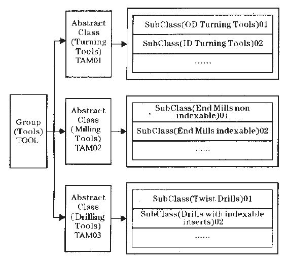 例如,数控刀具分类如图1所示,将数控刀具分为数控铣刀、数控车刀、数控钻头,然后再根据这三个方面的具体使用情况再次进行小类别的划分,例如其中的铣刀就可以分为一般铣刀、T形铣刀等,同样的分类方式可以应用到其它数控刀具中。利用这样的分类形式就可以真实地反映数控刀具的客观存在情况,而且提供用户可以方便地管理和使用数控刀具的具体实例。这样数控刀具就在分类层次少的基础上尽可能的涵盖所有数控刀具,做到了分类清楚、全面,管理灵活、方便。