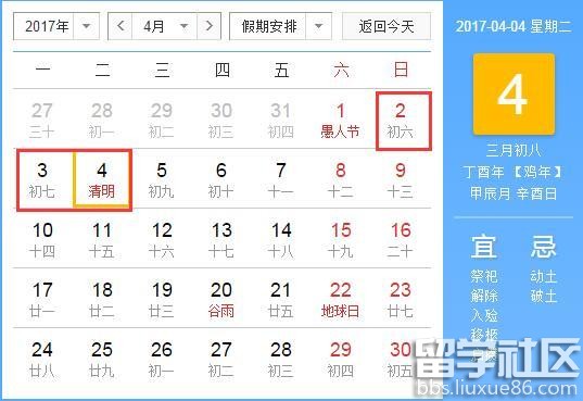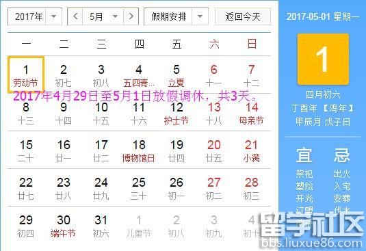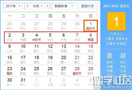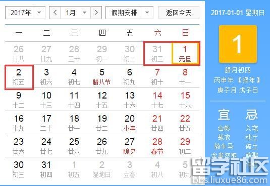 | 2017年放假安排时间表 国务院办公厅关于2017年节假日安排的通知 国办发明电〔2016〕17号 各省、自治区、直辖市人民政府,国务院各部委、各直属机构: 经国务院批准,现将2017年元旦、春节、清明节、劳动节、端午节、中秋节和国庆节放假调休日期的具体安排通知如下。 一、元旦:1月1日放假,1月2日(星期一)补休。 ![]() 二、春节:1月27日至2月2日放假调休,共7天。1月22日(星期日)、2月4日(星期六)上班。 ![]() 三、清明节:4月2日至4日放假调休,共3天。4月1日(星期六)上班。 ![]() 四、劳动节:5月1日放假,与周末连休。 ![]() 五、端午节:5月28日至30日放假调休,共3天。5月27日(星期六)上班。 ![]() 六、中秋节、国庆节:10月1日至8日放假调休,共8天。9月30日(星期六)上班。 ![]() 节假日期间,各地区、各部门要妥善安排好值班和安全、保卫等工作,遇有重大突发事件,要按规定及时报告并妥善处置,确保人民群众祥和平安度过节日假期。 国务院办公厅 |