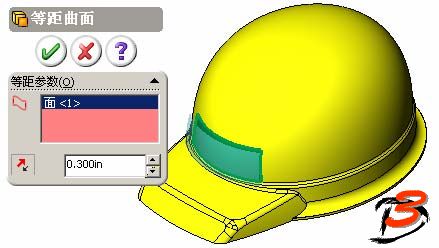 | 安全帽建模(2)——曲面应用一例 1.3 等距曲面 建立等距实体是生成一个与原始几何体相关形状的好办法。在SolidWorks中,使用等距的方法不仅能够建立等距草图,而且还能够建立等距曲面。 利用“等距曲面”命令,可以利用一个曲面或模型表面建立一个等距的曲面。等距曲面的偏移距离可以为零,当需要使用模型表面作为曲面参与操作时,建立一个等距量为零的等距曲面是比较好的方法。用户可以通过如下方式找到这个命令: