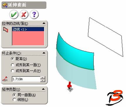 现在还不能拉伸草图到等距曲面上,因为草图的一部分还位于曲面的外部。