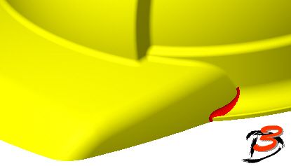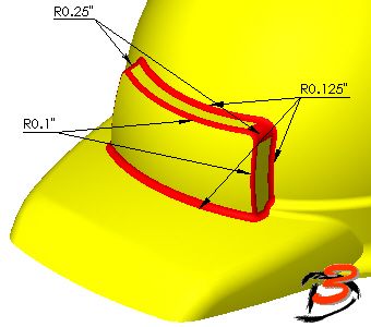 在头盔帽舌的两侧与头盔主体交线处添加半径为0.125”的圆角(两处)。如图5-64所示。 图 5-64另一个圆角