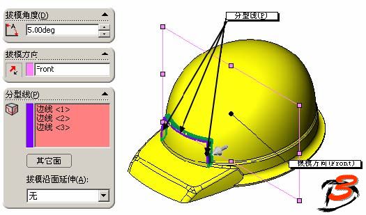 | 安全帽建模(3)——曲面应用一例 1.5 隐藏/显示实体 有时由于其它曲面的妨碍,用户在操作过程中可能看不到正在使用的曲面。例如,当延伸等距曲面的底边时,由于延伸将在头盔实体的内部进行,所以看不到正在延伸的曲面的情况。 用户可以通过如下方法在模型中隐藏或显示实体或曲面实体: