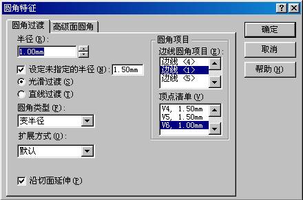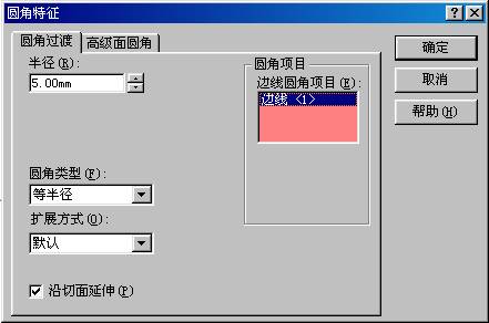 选择上图所示5mm的边,作为圆角的边,半径的值改成5mm,其他设置如图。