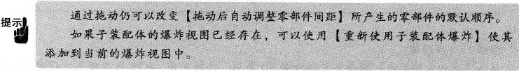 | 14.5.2 爆炸单个零部件 用户可以沿一个方向或多个方向移动一个或多个零部件。一个或多个零部件在单方向的每一次移 动都被认为是一步。 ![]() ![]() 移动操作杆:如果移动操作杆的轴没有指向所要求的方向,则用户可以移动它并调整到所要求的方向。拖动移动操作杆的原点,并把它放置在模型边、轴、模型面或平面上,以重新定位它,如图10-24所示。 ![]() 14.5.3 爆炸多个零部件 用户可以沿着单个路径或多个路径爆炸多个零部件。当选择了多个零部件后,最后被选择的零部件决定了移动操作杆的方向。 ![]() ![]() 1.拖动箭头 移动轴被用作爆炸步骤的方向矢量。爆炸确定后,爆炸步骤中的爆炸距离可以通过 单击爆炸步骤对话框中的特征,拖动爆炸线上的蓝色箭头来修改。 2.编辑步趣 右键单击爆炸步骤,从快捷菜单中选取【编辑步骤】。可以编辑此步操作中的零件 或精确定义爆炸距离。 ![]() ![]() ![]() 14.5.4 爆炸子装配 子装配体可以被看成以下几种方式。作为一个部件,子装配体能够以一个零件方式移动;作为单 独的部件,子装配体中每个零件可以独立地移动;当子装配体的爆炸视图存在时,它可以添加到当前 爆炸视图中。 14.5.5 自动间距零部件 使用【拖动后自动调整零部件间距】选项来展开沿单个轴向步趣瀑炸的一系列零部件。使用滑动 块可以设置间距,并且设定后的间距也可以改变。 【选择子装配体的零件】选项把子装配体作为一个单独的部件。 ![]() ![]() |
