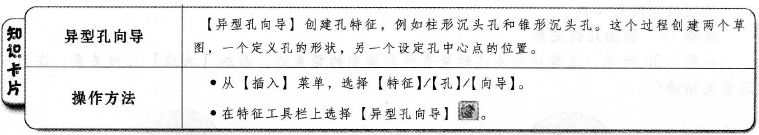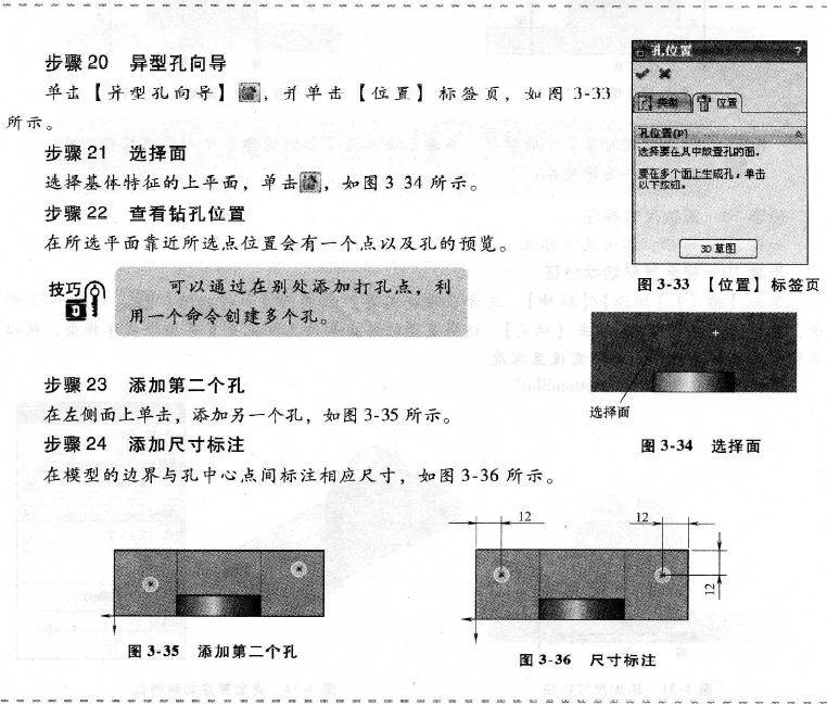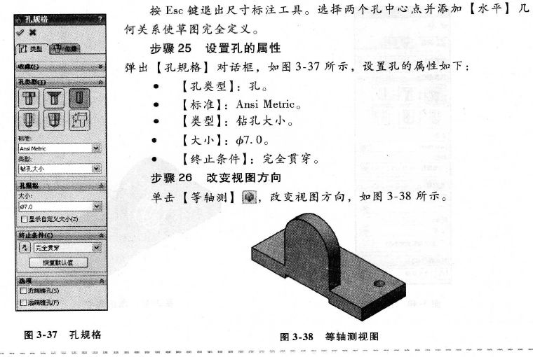 | 3.8 切除特征 在创建两个主要的凸台特征后,现在可以创建切除特征来表示材料的切除。切除特征与凸台特征 创建的方法是一样的。在本例中,通过绘制草图和拉伸来实现。 ![]() ![]() ![]() 3.9 使用异型孔向导^ 【异型孔向导】是用于在实体上创建特殊孔。它可以一步步创建简单直孔、锥孔、柱孔和螺纹孔。本例中,我们使用【异型孔向导】来创建标准直孔。 3.9.1 创建标准直孔 用户选择插入孔的平面,然后通过【异型孔向导】来定义孔的尺寸和孔在平面上的位置。【异型孔向导】最直观的方面之一是用户可以通过将加入到孔中的紧固件来指定孔的尺寸。 ![]() ![]() ![]() |