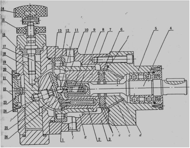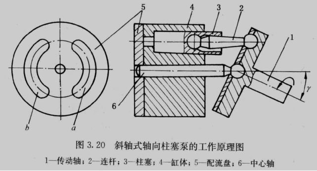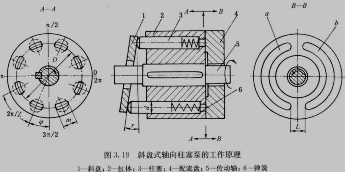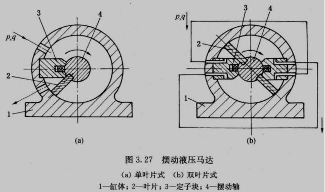 | 3.4 柱塞泵 优点: 容积效率高、只需改变柱塞的工作行程就能改变泵的排量、压应力。 应用: 高压大流量。 ●轴向柱塞泵 ●变量轴向柱塞泵 ●径向柱塞泵。 3.4.1 轴向柱塞泵 ●斜盘式轴向柱塞泵的工作原理 ![]() 改变斜盘倾角γ的大小,就能改变柱塞的行程长度,也就改变了泵的排量。 改变斜盘倾角的方向,就能改变吸、压油方向(双向变量轴向柱塞泵)。 ●斜轴式轴向柱塞泵的工作原理 ![]() ●轴向柱塞泵的排量和流量 流量脉动,当柱塞数较多并为奇数时脉动较小,故柱塞泵的柱塞数一般为奇数,常取 7或9。 3.4.2 变量轴向柱塞泵 变量轴向柱塞泵:主体+变量机构 主体机构特点:滑履结构。中心弹簧机构。缸体端面间隙的自动补偿。配流盘。 变量机构:改变斜盘倾角γ的大小以调节泵的排量。 SCY14-1型斜盘式轴向柱塞泵的结构 ![]() 3.4.3 径向柱塞泵 移动定子以改变偏心距的大小,便可改变柱塞的行程,从而改变排量。 改变偏心距的方向,则可改变吸、压油的方向。径向柱塞泵可以做成单向或双向变量泵。 ![]() 3.5 液压马达 高速小转矩液压马达(额定转速大于500r/min)。 低速大转矩液压马达:转速低、低速稳定性好、输出转矩较大。 摆动液压马达(摆动液压缸):单叶片式、双叶片式。 当进、回油的方向改变时,叶片就带动轴往相反的方向转动。 双叶片式摆动马达的输出转矩是单叶片式的两倍(相同结构尺寸和相同压力下),而摆动角速度则是单叶片式的一半(输入流量相同时)。 摆动液压马达 ![]() |