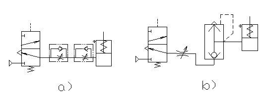 | 第17章 气动控制元件与基本回路(3) 6、高低压转换回路: 用于低压气源或高压气源的转换输出。 ![]() 图17-21 高低压转换回路 ◆节流阀:通过改变阀的通流面积来调节流量。 节流阀的工作原理: ![]() 图17-22 节流阀原理图 17-23 节流阀结构图 1、节流阀的应用: ![]() 图17-24 节流阀的应用 2、排气节流阀: 不仅具有节流调速的作用,而且还能起到降低排放气流噪声的作用。 ![]() 排气节流阀只能安装在排气口,调节排出气体的流量以控制执行元件的速度。 3、柔性节流阀: 通过调节阀杆夹紧柔韧的橡胶管而产生节流作用。 ![]() 图17-26 柔性节流阀 4、单作用气缸速度控制回路 ![]() 图17-27 单作用气缸速度控制回路 5、单向调速回路 节流供气 节流排气 结论: 排气节流调速与进气节流调速相比具有进气阻力小, n 气缸速度受外界负载变化影响小的特点,所以应用较普遍。 6、双向调速回路 ![]() 图17-28 双作用气缸的速度控制回路 7、缓冲回路 功能: 可降低或避免气缸行程末端活塞与缸体的撞击。 场合: 在行程长、速度快、惯性大的场合,除采用缓冲气缸外,一般还采用缓冲回路。 ![]() 图17-29 缓冲回路 8、速度换接回路 ![]() 图17-30 速度换接回路 |