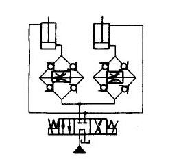 三个分流集流阀按图示连接,阀1通过的流量是阀2流量的两倍,在阀1分流基础上再经过阀2分流并分别控制四只液压缸的同步。该回路压力损失大,只适用于中高压系统,同步精度仅为6%~12%左右。 |