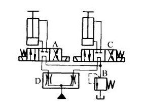 当换向阀A和C均为左位时,液压泵输出的液压油流经分流阀后分成两股相等的流量,又因两液压缸活塞面积相同,所以两缸的活塞保持同步上升。换向阀A和C均为右位时,则两缸活塞同步下降。同步精度一般可达2%~5%左右。 |