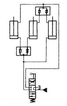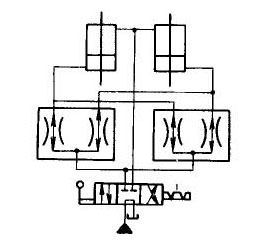 使用两个规格适宜的分流集流阀,按图示连接,可以保持三只液压缸的速度同步,它利用该阀分流和集流流量一致的特性。该回路同步精度仅为5%~10%左右,功率损耗较大。 |