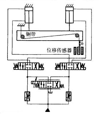 用位移传感器来检测两个缸的位置误差,用伺服阀控制纠正误差所需的流量,这是一种带反馈的闭环同步控制回路,液压缸的位置误差会形成活动部件倾斜,用位移传感器检测钢带活动端位置, h值的变化,经过放大器比较后再反馈到伺服阀,实现缸的位置同步,这种带反馈的闭环同步控制回路可以得到很高的同步精度。 |