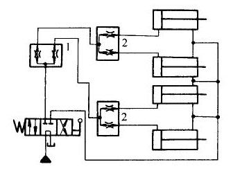 图中采用了四个单向阀组成的流量调整板,不管液压缸的活塞伸出还是缩回,液流始终单方向流经调速阀,图中,活塞伸出为进油节流调速,下降时为回油节流调速。调节调速阀的开度,可使两液压缸保持同步,同步精度一般可达5%~10%左右。 |