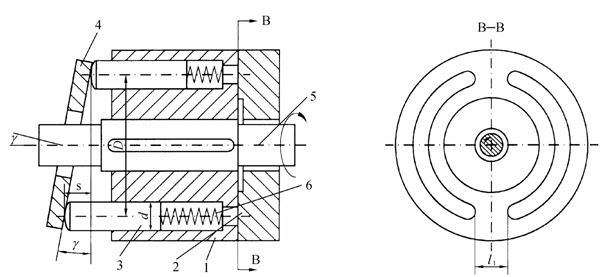1—缸体 2—配油盘 3—柱塞 4—斜盘 5—传动轴 6—弹簧
